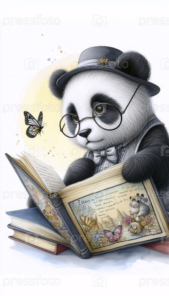 Панда читает сказку перед сном акварельный арт-принт, Ai generated image