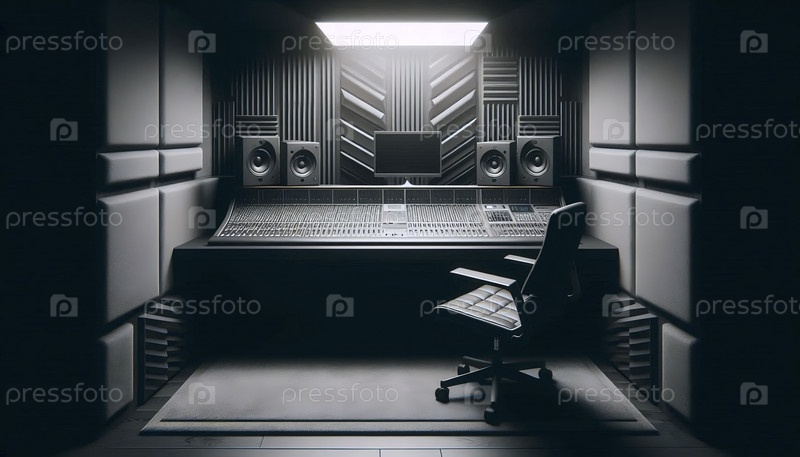 Глубокий макет рабочего стола в студийном стиле с пустым угловым слотом для консоли смешивания, установленный в комнате со обработанными стенами, Ai generated image
