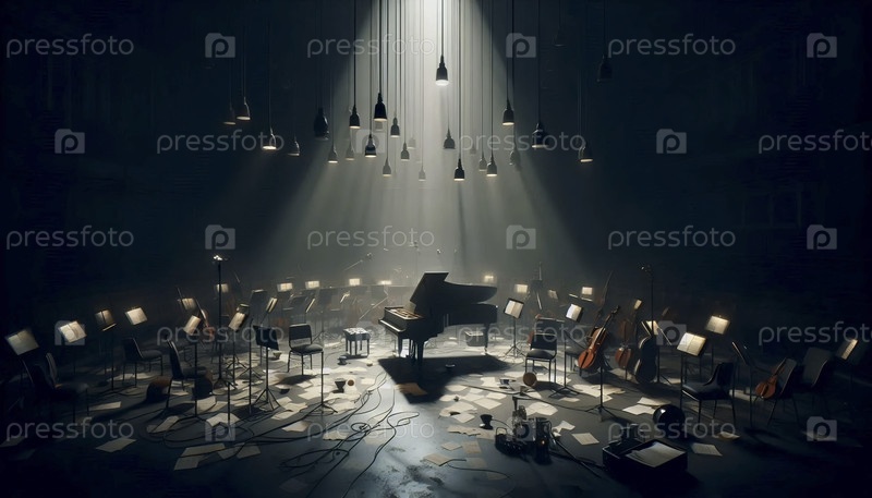 Более широкий снимок всей слабо освещенной ямы, чашки на пианино, брошенные инструменты