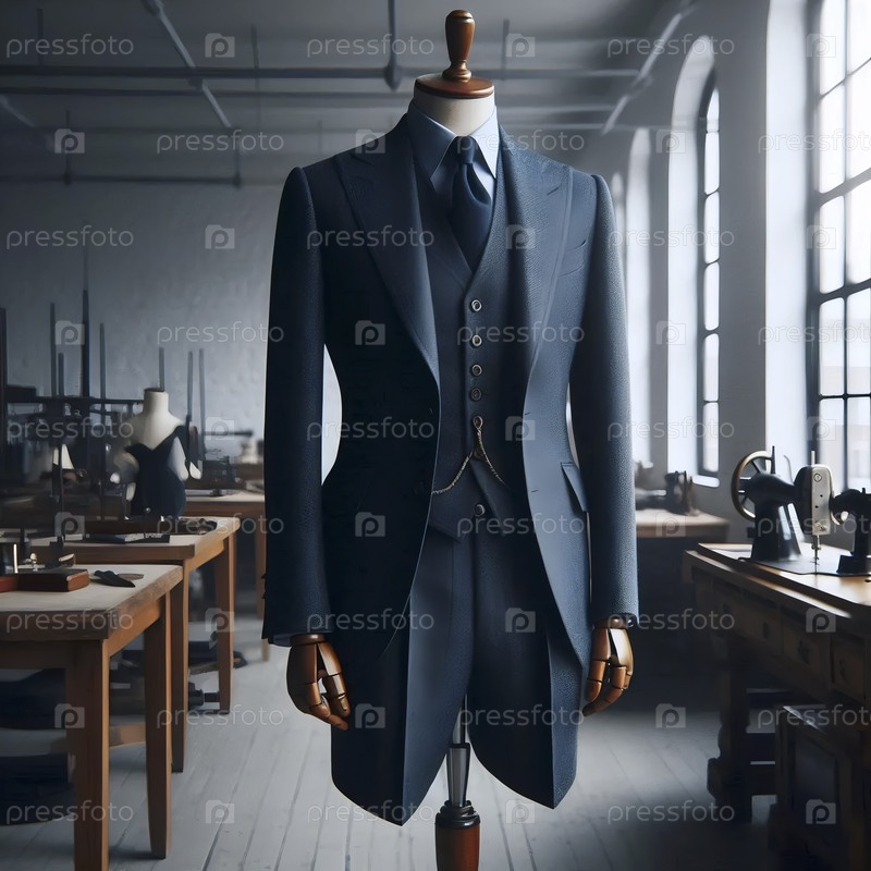 Классический макет трехкомпонентного костюма из военно-морской шерсти, расположенный на манекену портного, Ai generated image