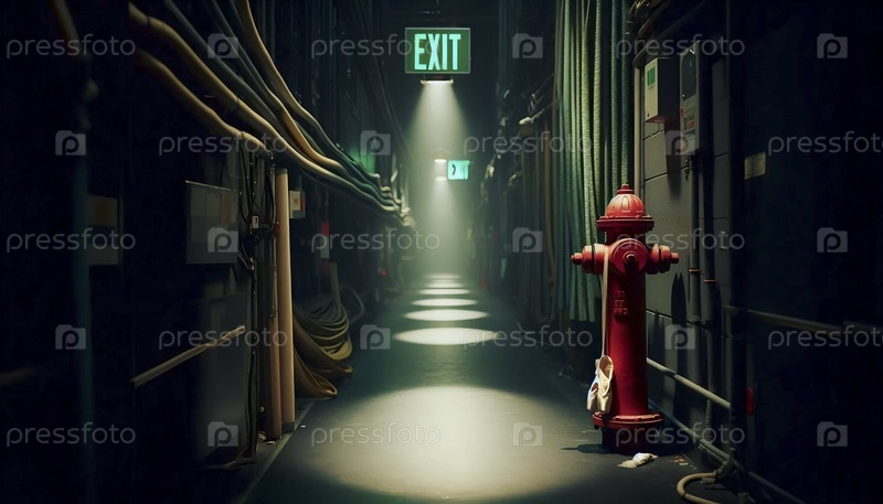 Широкий, атмосферный снимок слабо освещенного коридора за кулисами с гидрантом в качестве фокусной точки
