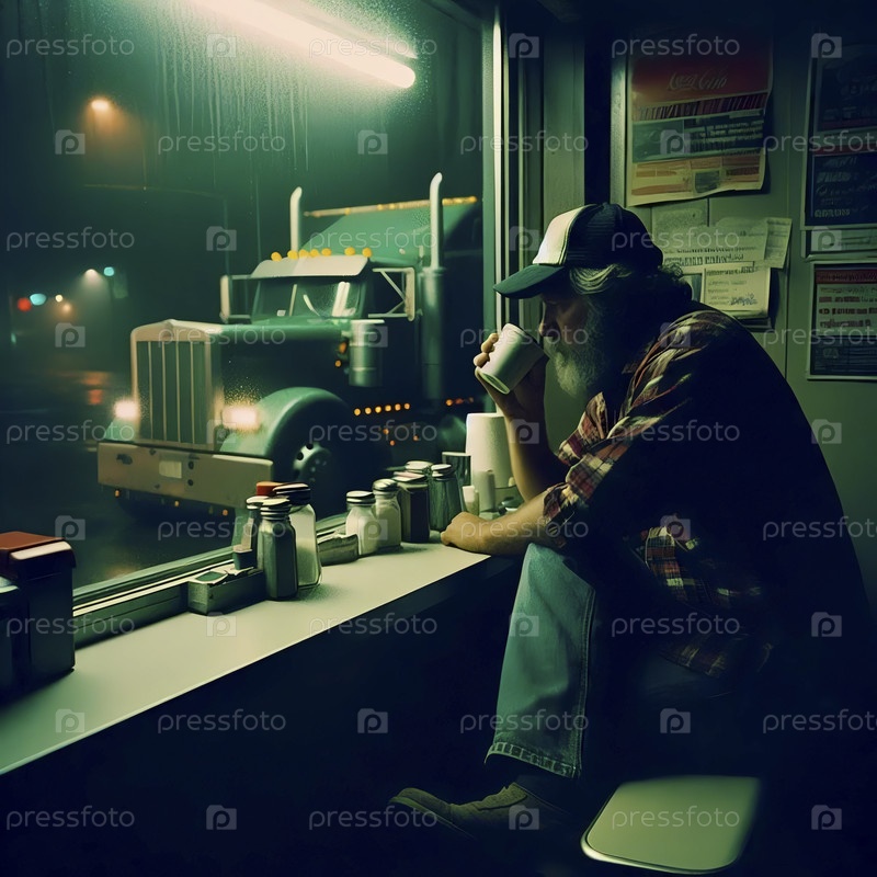 Водитель грузовика 1970-х годов в придорожной закусочной ночью, Ai generated image