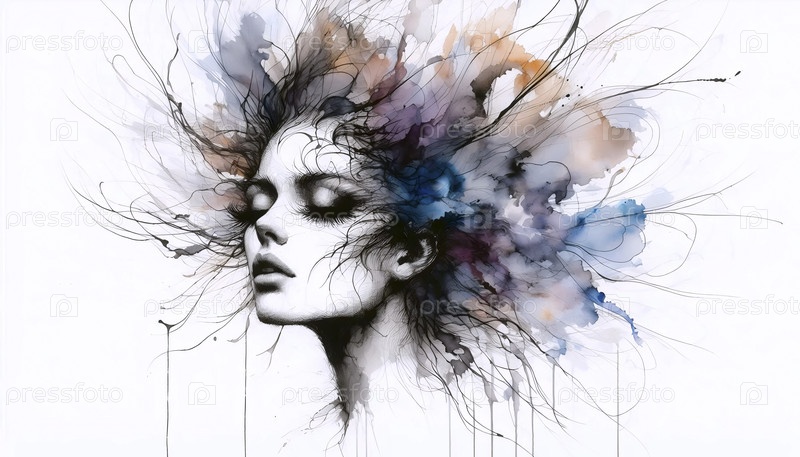 Портрет в очертаниях чернила и волосы акварель, Ai generated image