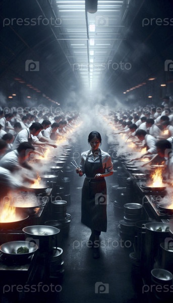 Более широкий кинематографический снимок окружающей среды, сделанный на хаотичной промышленной кухне, заполненной паромом во время обеда, Ai generated image