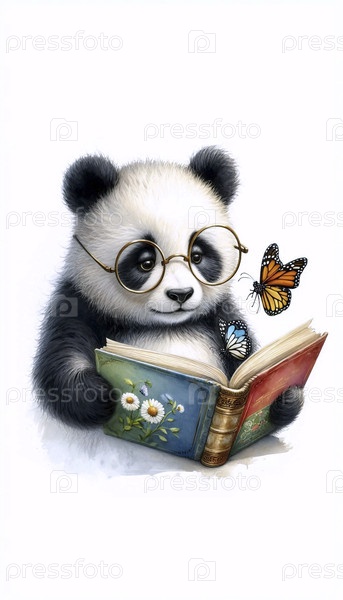 Панда читает сказку перед сном акварельный арт-принт, Ai generated image