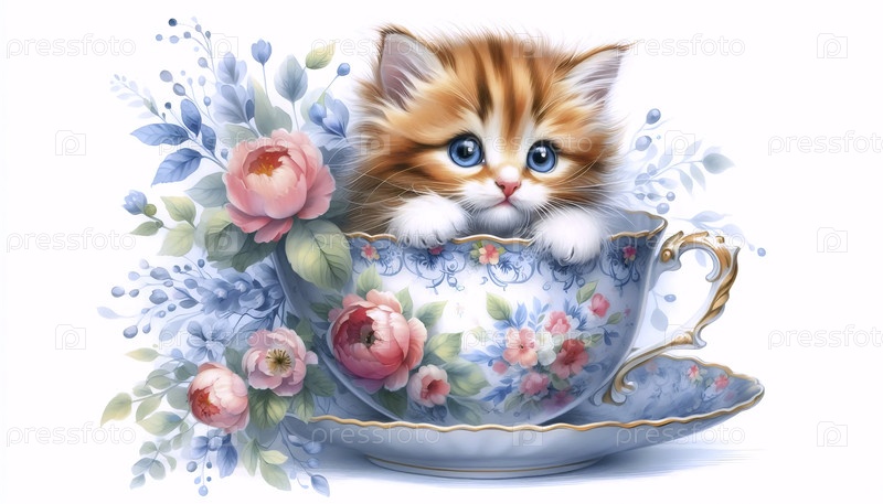 Котенок в чайной чашке Акварельная художественная печать, Ai generated image