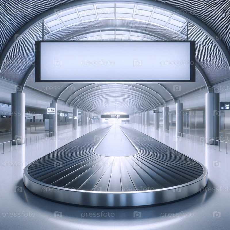 Выгнутый панорамный рекламный макет-панел расположен над пустой багажной каруселью аэропорта, Ai generated image
