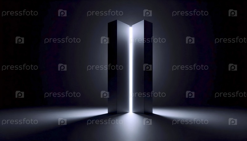 Макет высокой матовой черной цилиндрической колонны в пустом темном пространстве, освещенный вертикальным разрезом света от скрытого источника
