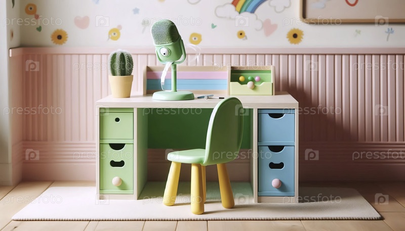 Небольшой красочный макет рабочего стола со встроенными шкафами для хранения и крошечным пустым микрофоном на низком стенде, в игровой комнате Ai создал изображение