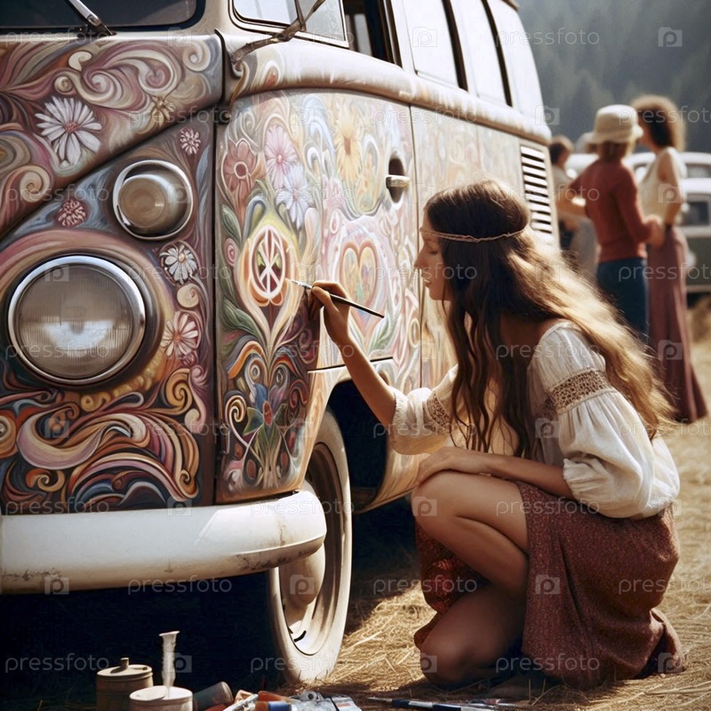 Хиппи 1960-х годов, рисующий психоделический фургон, Ai generated image