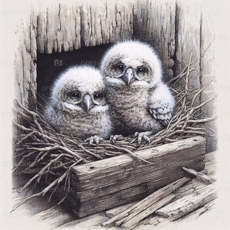 Два цыпленка совы в гнезде чернила рисунок художественная печать, Ai generated image