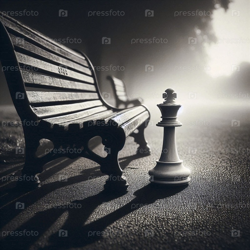 Одинокая шахматная фигура на скамейке в парке, Ai generated image