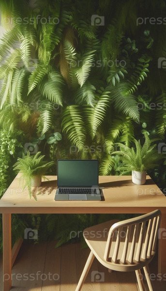 Макет легкого дубового стола, расположенного против пышной вертикальной зеленой стены живых растений с пустым пространством для ноутбука, Ai создал изображение