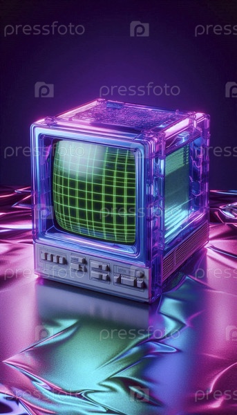 Транслюцентно-фиолетовый макет монитора CRT, отображающий сетку на серебряной голографической поверхности