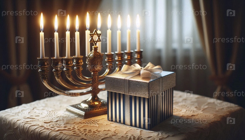 Мокет подарочной коробки с синими и серебряными полосами, размещенный рядом со светящимися свечами менора во время Хануки, Ай создал изображение