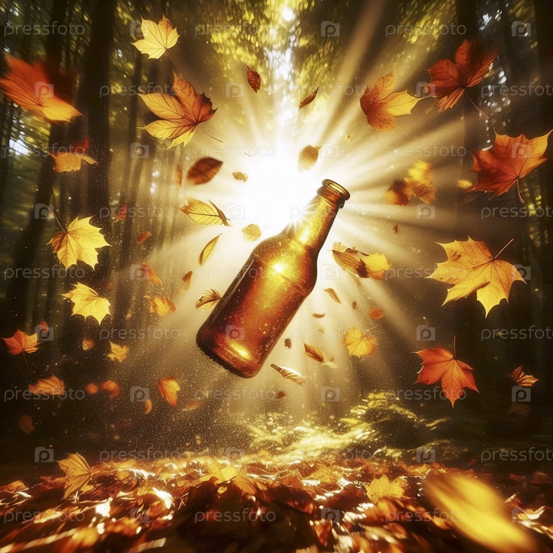 Макет бутылки с золотым оттенком, пойманный в середине осени среди вихревого каскада желтых и оранжевых кленовых листьев, Ai generated image