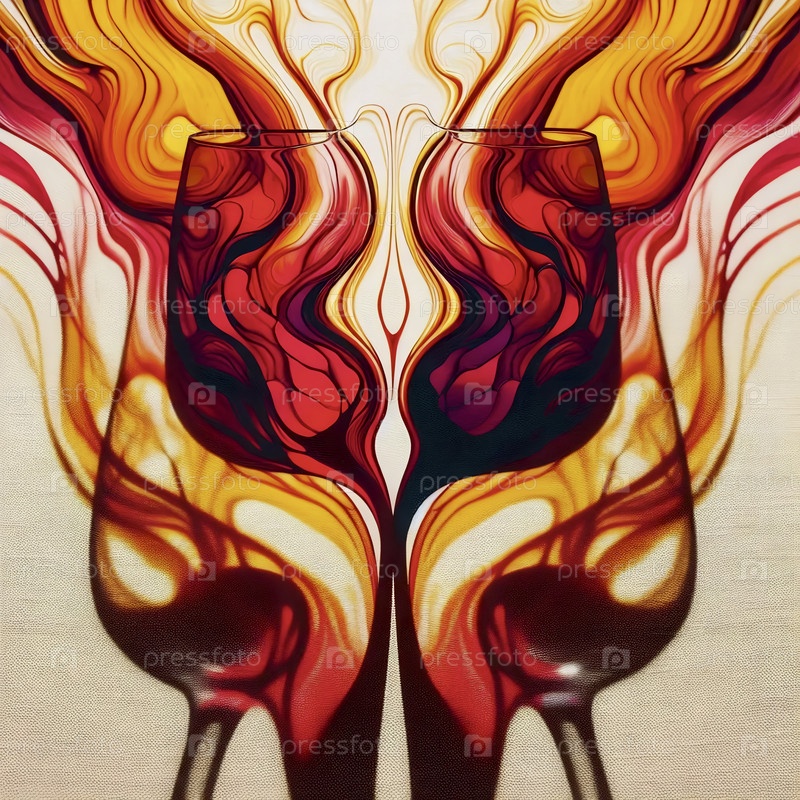 Цветная абстрактная крупнометражная фотография сливающихся теней из двух бокалов вина, Ai generated image