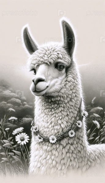 Пушистая лама с цветами чернила рисование художественная печать, Ai generated image