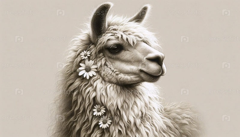 Пушистая лама с цветами чернила рисование художественная печать, Ai generated image