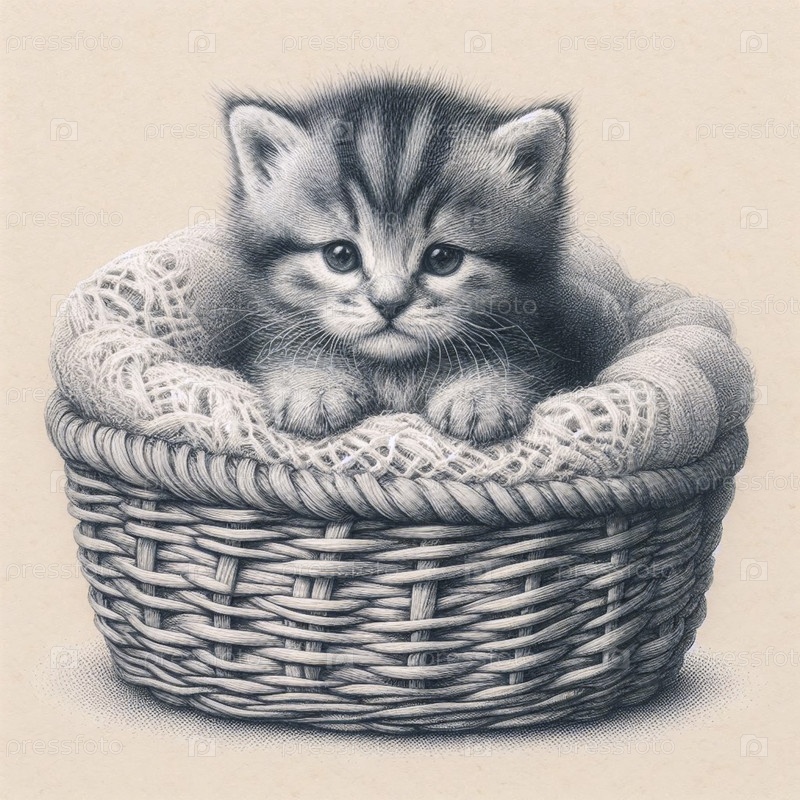 A kitten in a wicker basket ink drawing art print, Ai generated image Котенок в плетеной корзине чернил рисование художественное печать, Ай создал изображение