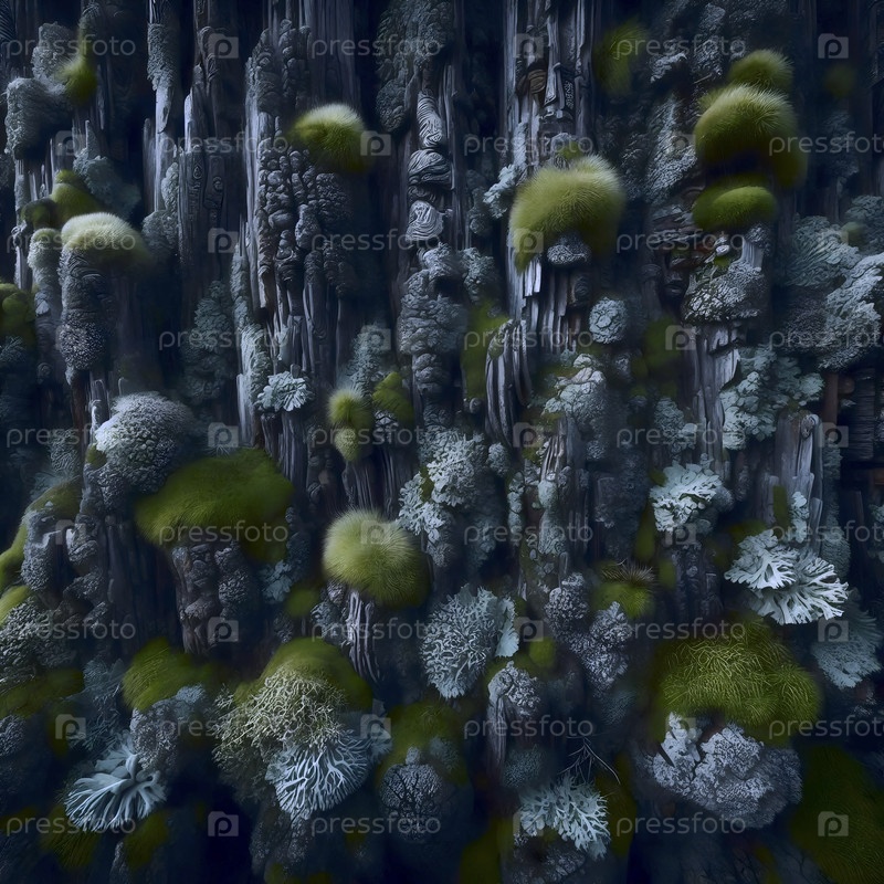 Экстремально крупный макет глубоко вырубленной коры дерева, показывающий слои мха и лишайника в лесу, Ai создал изображение