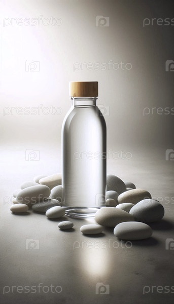 Гладкий макет стеклянной бутылки с бамбуковой крышкой, на кровати из гладких речных камней, Ai generated image