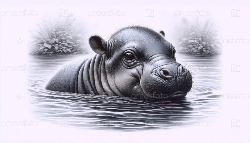Малыш карликового бегемота в мелководной чернице рисует художественную печать, Ai generated image