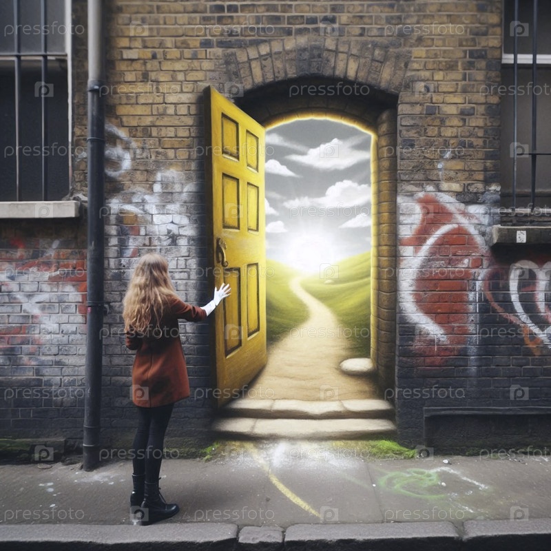 Женщина, открывающая дверь с мелом на кирпичной стене, Ai generated image