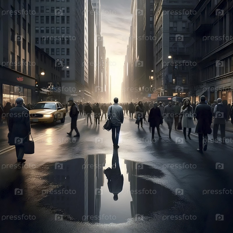 Крылья отражаются в луже у ног прохожих, которые их не видят, Ai generated image