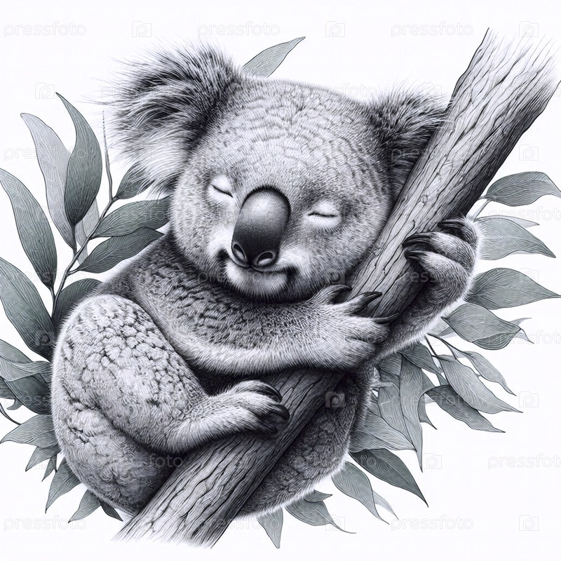 Коала обнимает ветвь эвкалипта чернила рисование художественная печать, Ai generated image