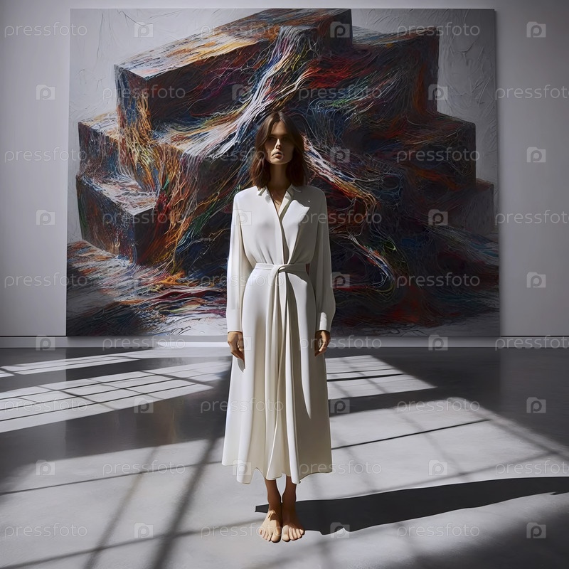 Модель в шелковой крепежной рубашке-одежде перед абстрактной скульптурой, Ай создала изображение