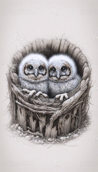 Два цыпленка совы в гнезде чернила рисунок художественная печать, Ai generated image