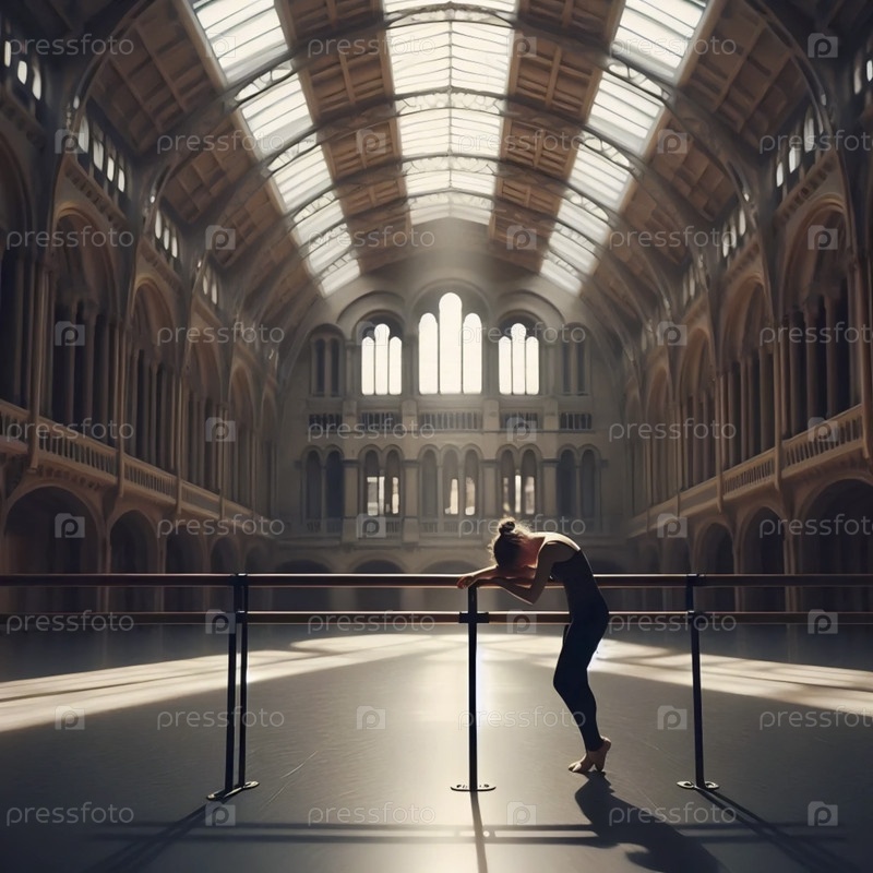 Более широкий снимок пустой студии, танцор опирающийся на бар, отражение небольших деталей, Ай создал изображение