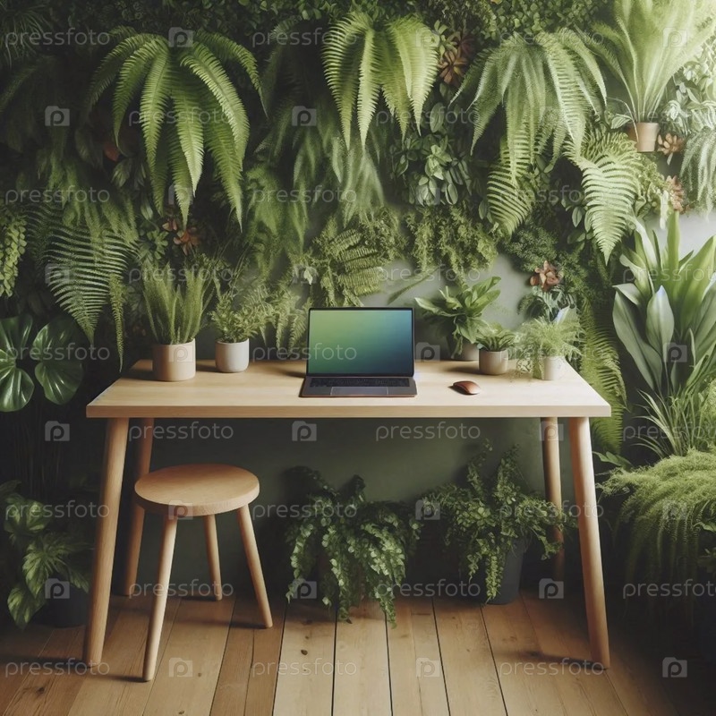 Макет легкого дубового стола, расположенного против пышной вертикальной зеленой стены живых растений с пустым пространством для ноутбука, Ai создал изображение