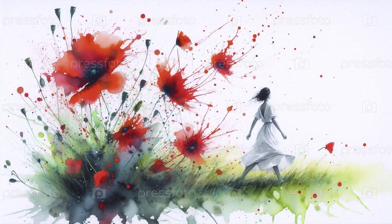 Поле маков, распыляющихся акварелью, Ai generated image
