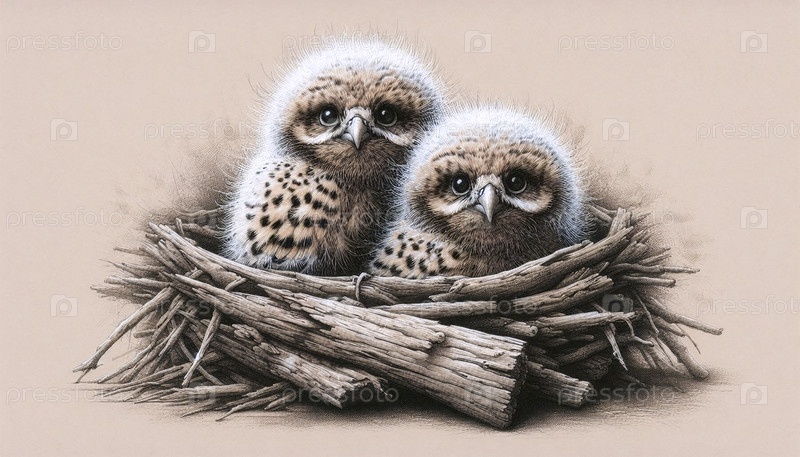 Два цыпленка совы в гнезде чернила рисунок художественная печать, Ai generated image
