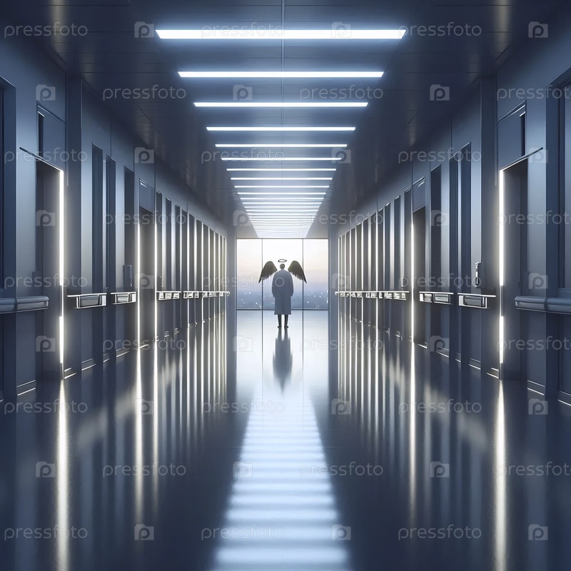 Более широкий снимок изнутри пустого коридора больницы, просматривая фигуру в окне, Ай создал изображение