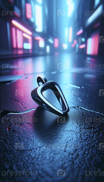 Чистый геометрический макет залога на подвеске, лежащий на дождливом черном асфальте под неоновыми знаками в темной аллее, Ai generated image