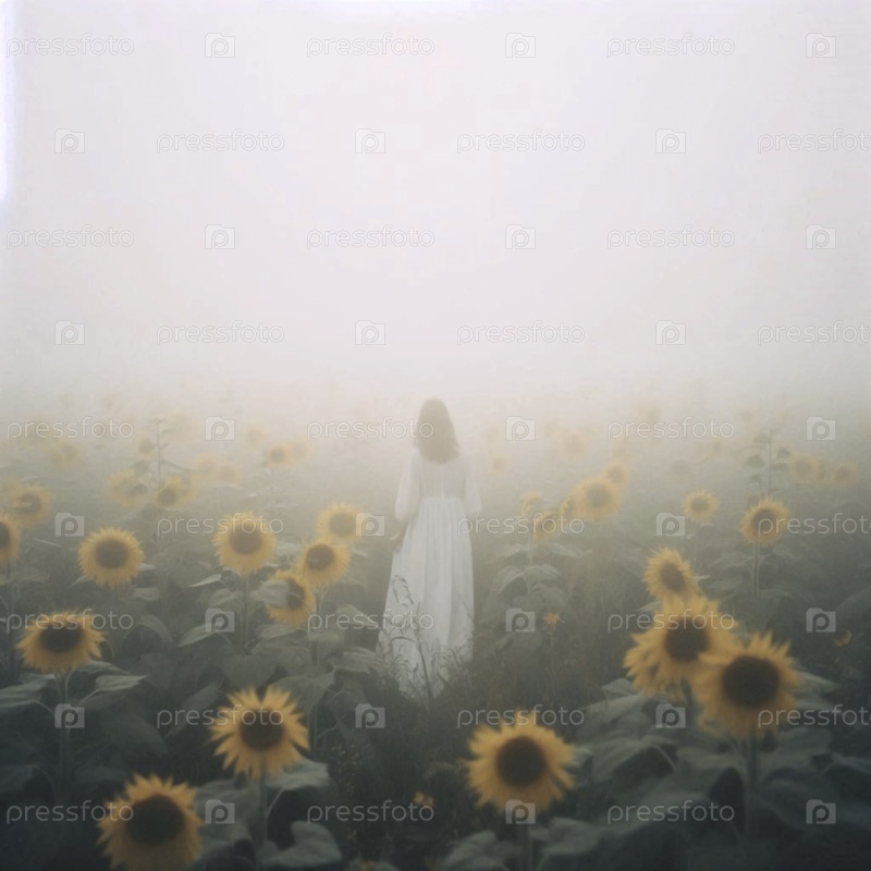 Женщина в белом среди туманного поля подсолнечника, Ai generated image