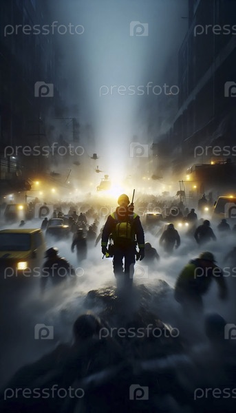 Более широкий, экологический акционный снимок, показывающий контекст хаоса, Ai создал изображение