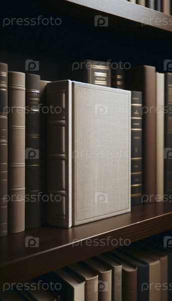 Мокет книги в жесткой обложке с пустой лентой, расположенный между другими книгами на полке, Ai generated image