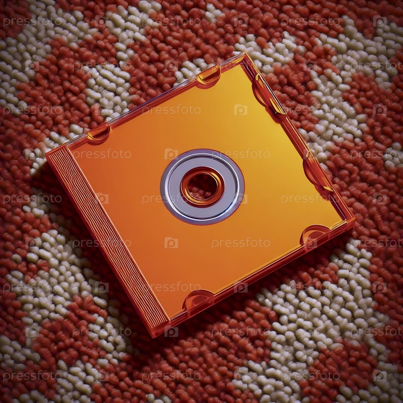 Ярко-оранжевый макет коробки для ювелирных изделий CD, пустой и слегка открытый на грязной текстуре пиксельного ковра