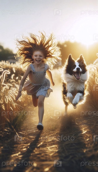 Девочка, бегущая с собакой через поле высокой травы, Ai generated image