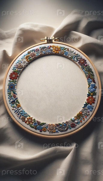 Детальный макет кольца для вышивки, показывающий пустую область ткани, плотно растянутую, окруженную сложной бусинной вышивкой, Ai generated image
