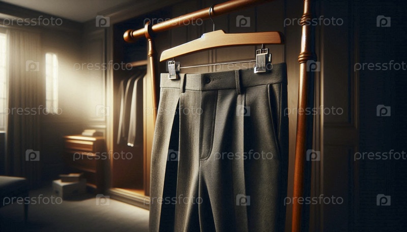 Макет серых шерстяных брюк, аккуратно напечатанный и положенный над деревянным столом для валета, Ай создал изображение