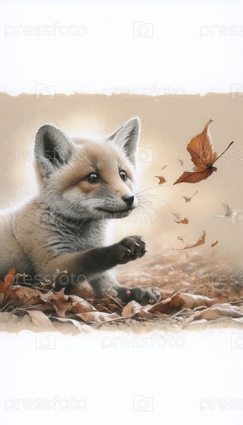 Лисичье детеныше с падающим чернилом листьев рисует художественный принт, Ai generated image