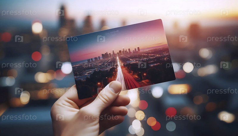 Мокет почтовой карты с глянцевым отделением, удерживаемый между большим и указательным пальцами на фоне боке городского пейзажа, Ай создал изображение