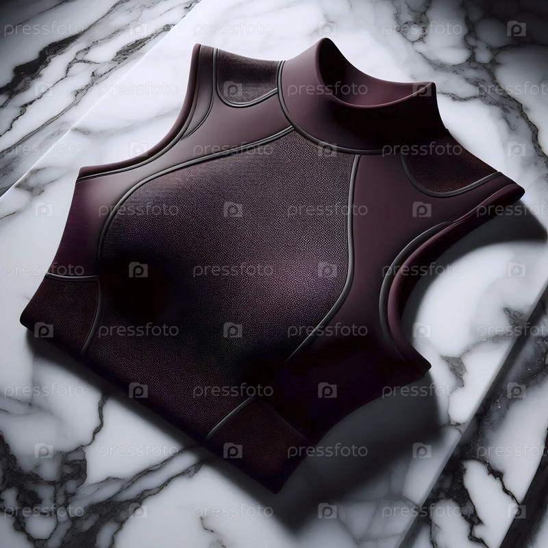 Макет высокого шея из неопрена в бургундском цвете, заложенный на полированной мраморной плите, Ai generated image