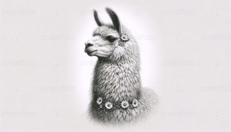 Пушистая лама с цветами чернила рисование художественная печать, Ai generated image
