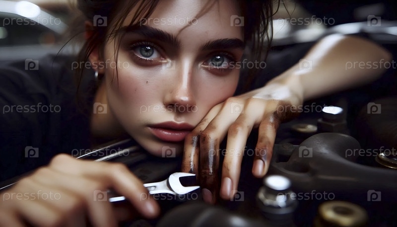 Ближайший план рук и лица девушки-механика, Ай создал изображение